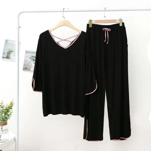 Plain Black with Pink Lace V Neck with Palazzo Pajama Full Sleeves Night Suit for Her
