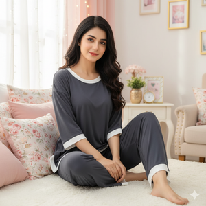 - Product Name : Plain Grey with White Round Neck and Quarter Sleeves T Shirt with White Panel Palazzo Style Pajama Suit for Her